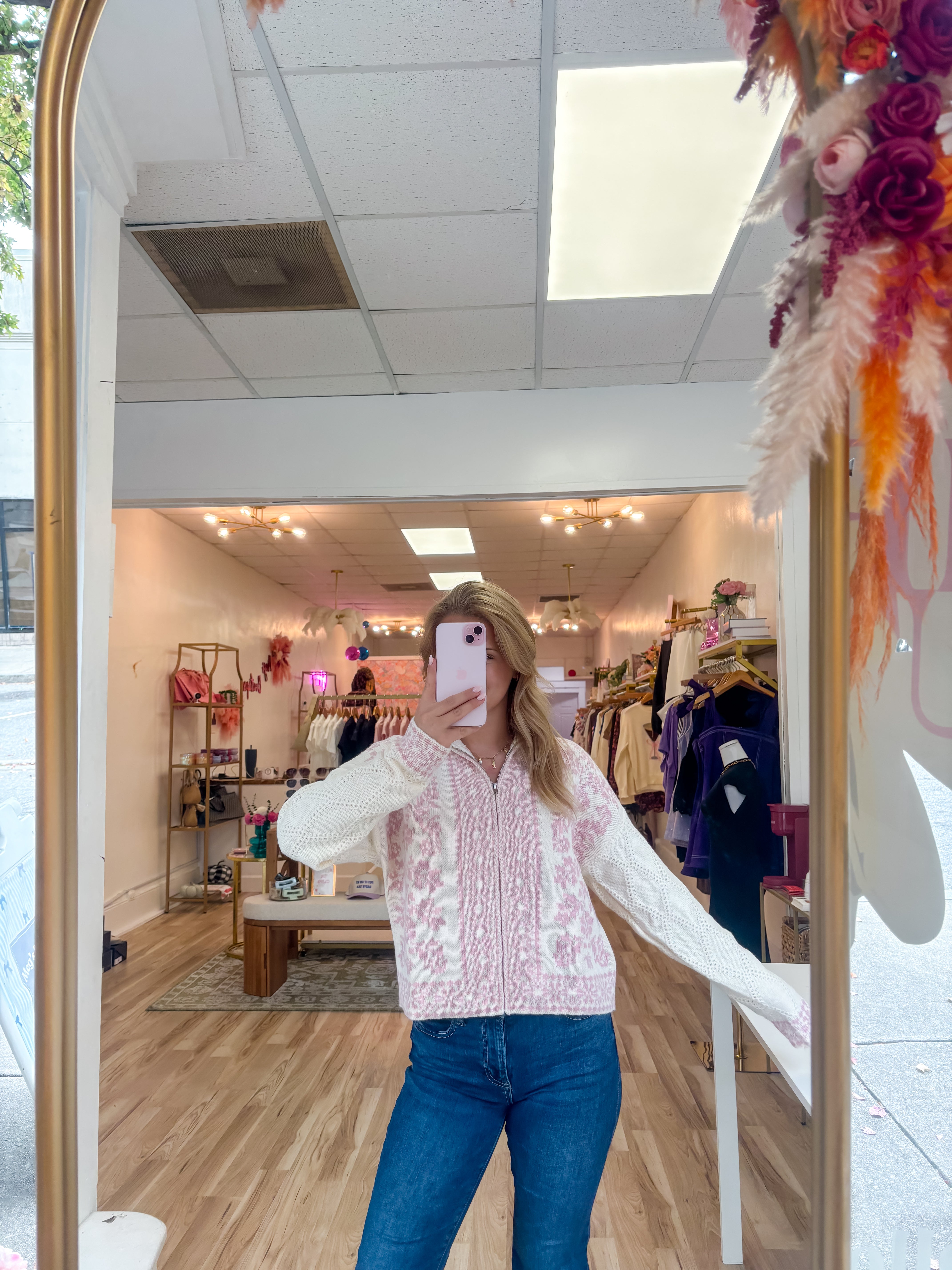 - Graphic Knit Sweater Zip Up Cardigan - Mock Neck - Long Sleeve - Drop Shoulder