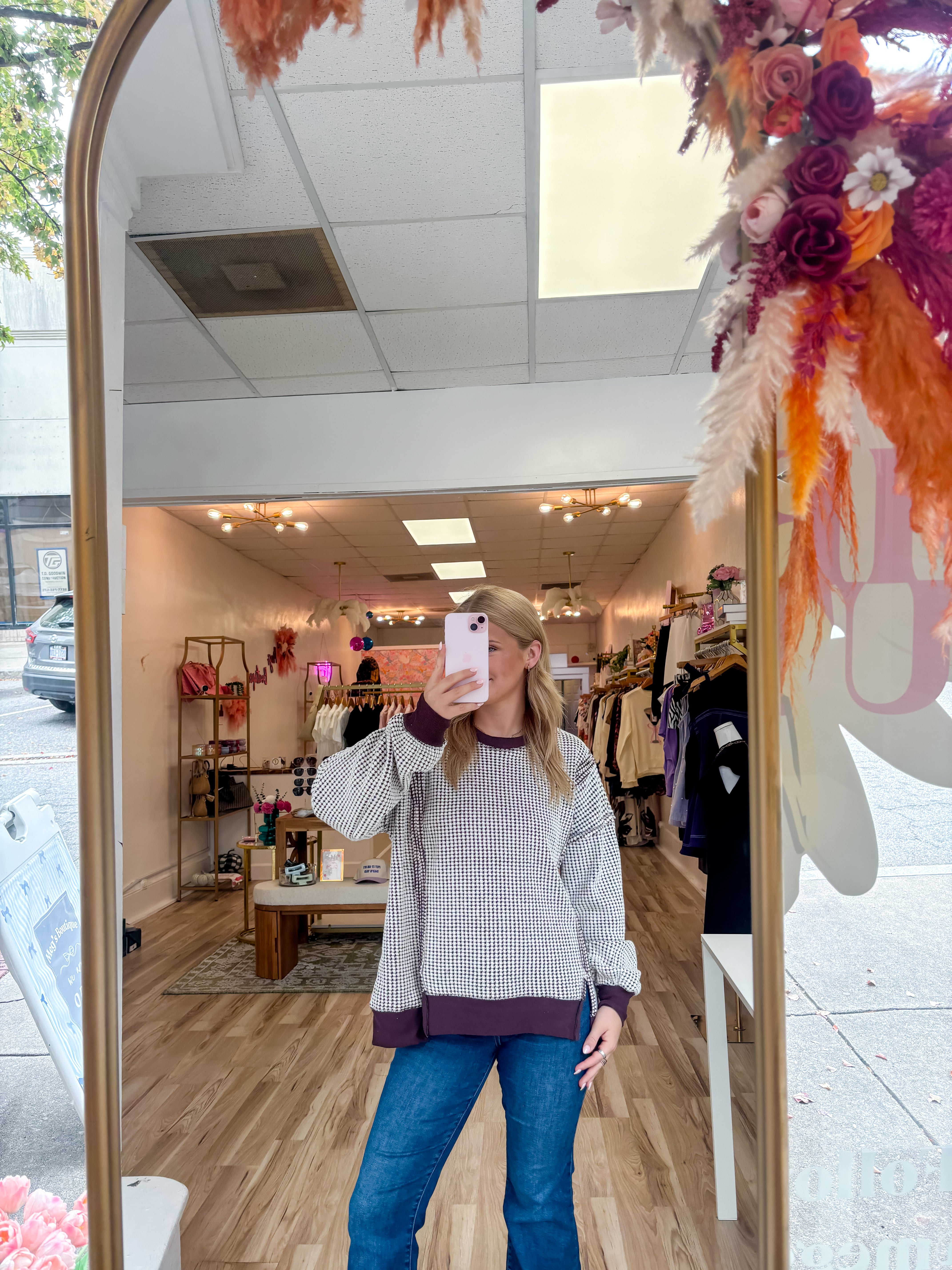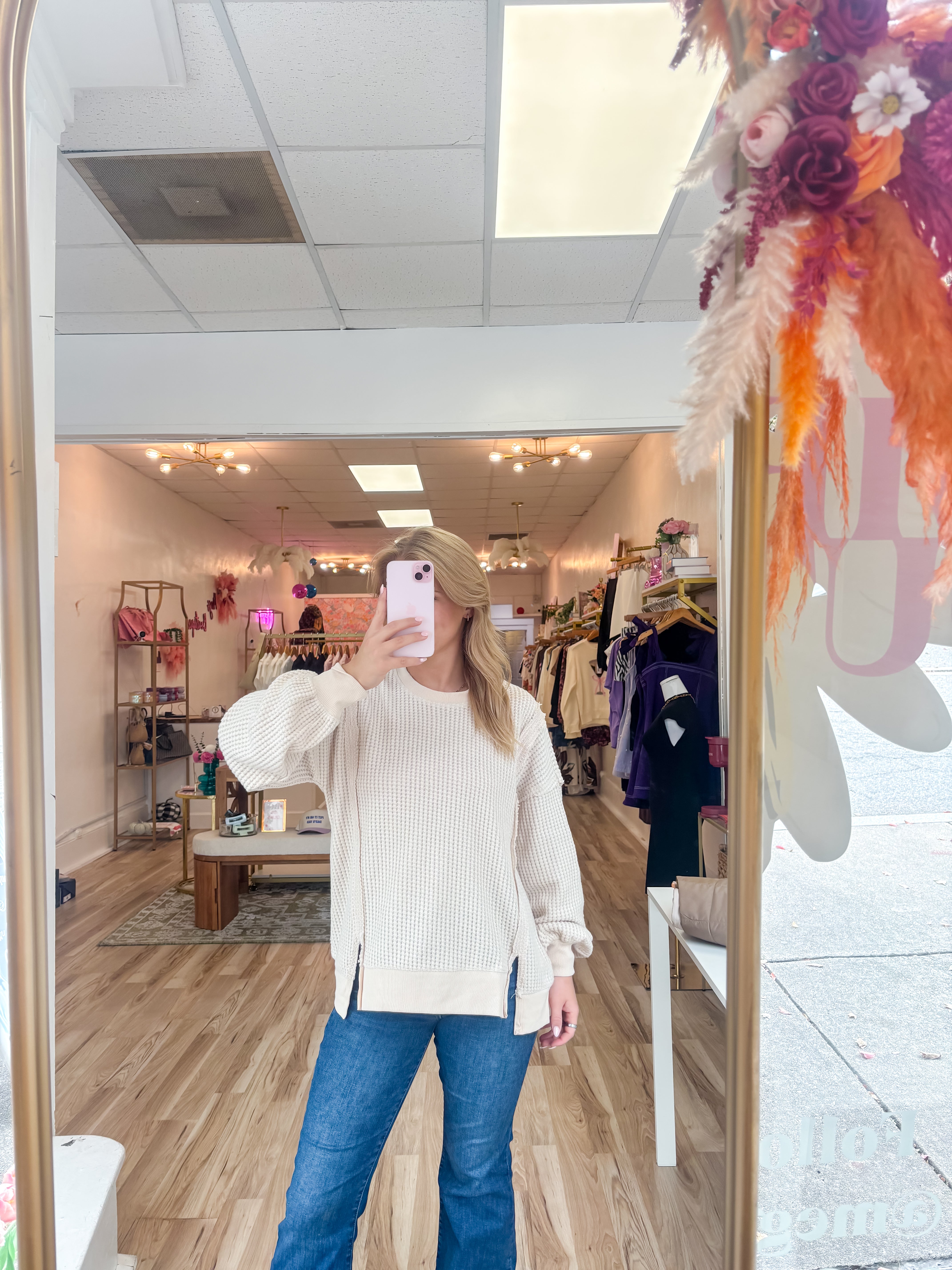 - Oversized Waffle Knit Casual Top - Drop Shoulder - Round Neck - Long Sleeve - Front Slit - Raw Edge Detail
